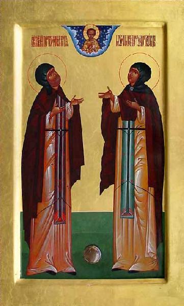 Они скончались в один день и час, каждый в своей келье. Люди сочли нечестивым хоронить в одном гробу монахов и посмели нарушить волю усопших. Дважды их тела разносили по разным храмам, но дважды они чудесным образом оказывались рядом. Так и похоронили святых супругов вместе около соборной церкви Рождества Пресвятой Богородицы, и всякий верующий обретал здесь щедрое исцеление.