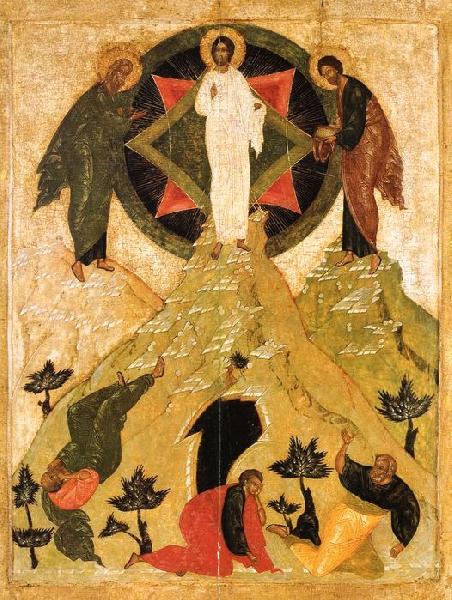 Востаните ленивии, иже всегда низу поникшии в землю, души моея помыслы, возмитеся и возвыситеся на высоту божественаго восхождения: притецем к Петру и к Зеведеовыма, и вкупе со онеми Фаворскую гору достигнем, да видим с ними славу Бога нашего, гласа же услышим, иже свыше слышаша, и проповедаша Отчее сияние.